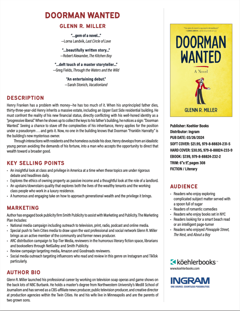 “With the deft touch of a master storyteller, Glenn Miller brings us into the life of a New York City apartment building and peoples it with individuals whom we want to know… With a style that flows like a soft breeze and characters as distinctive as the city in which they live, Doorman Wanted is a delightful, meaningful and important book that belongs on the top shelf of any library.“